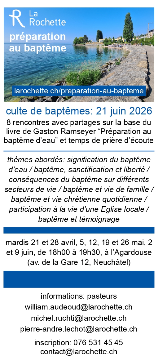 La Rochette propose une préparation au baptême qui peut être suivie par toute personne qui s’intéresse à cette possibilité de marquer une étape importante dans son cheminement de foi.
