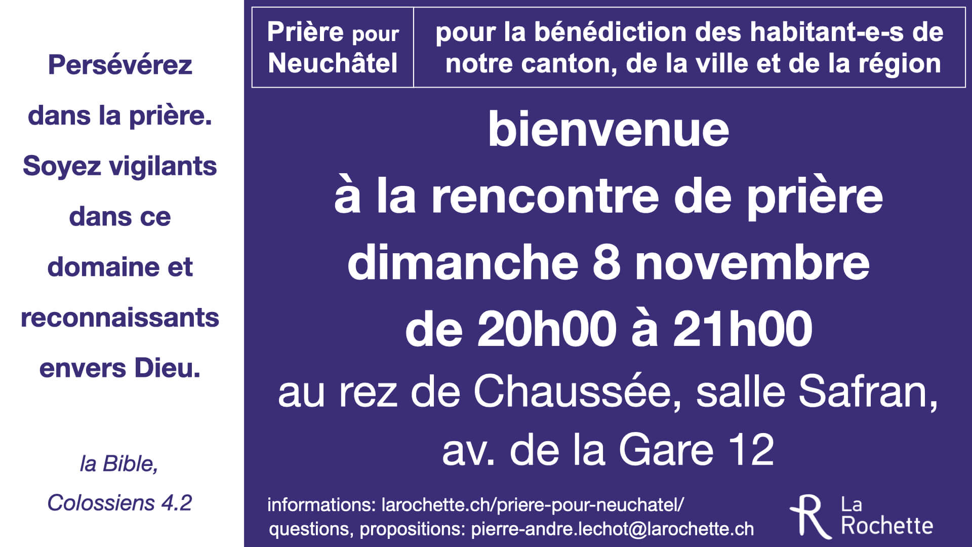 PROCHAINE RENCONTRE de prière pour Neuchâtel: dimanche 8 novembre, 20h00-21h00, salle Safran, Avenue de la Gare 12 à Neuchâtel. Nous prierons en particulier pour: