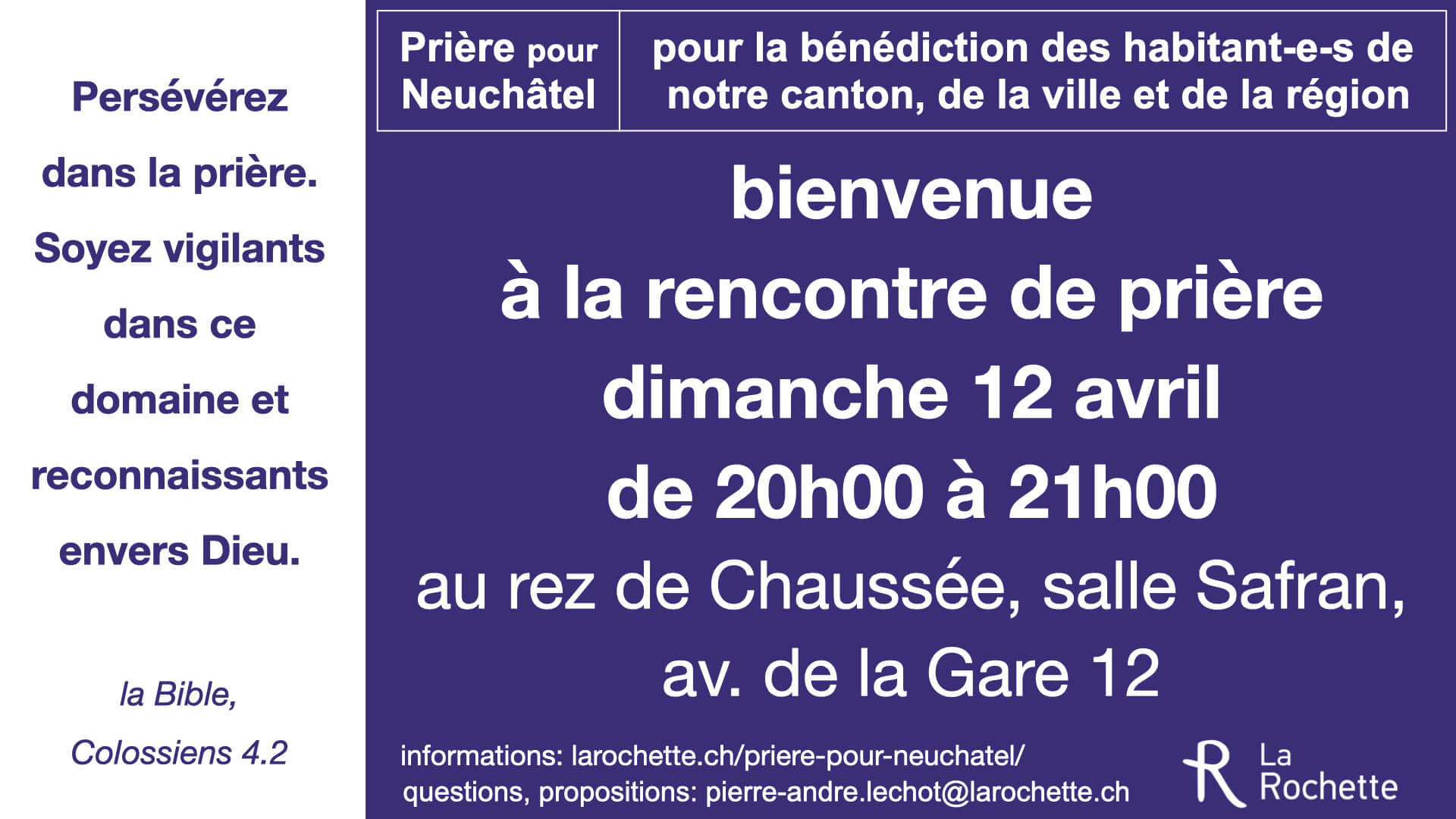 PROCHAINE RENCONTRE de prière pour Neuchâtel: dimanche 12 avril, 20h00-21h00, salle Safran, Avenue de la Gare 12 à Neuchâtel. Nous prierons en particulier pour: